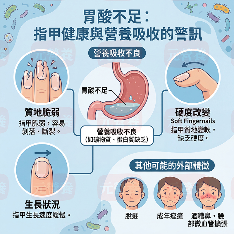 當低胃酸狀態持續存在,會進一步影響多種營養素吸收,並反映在下游指標上: