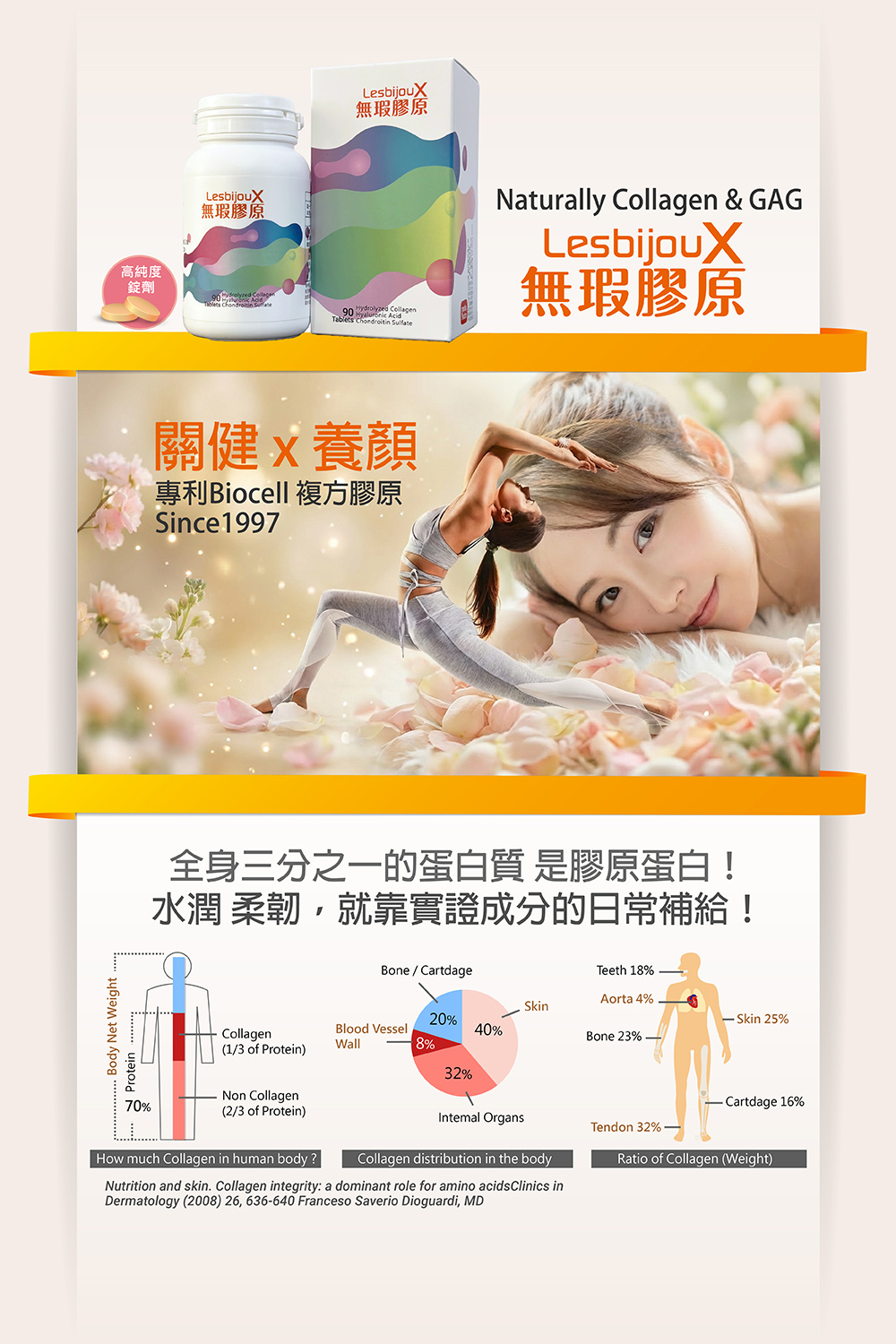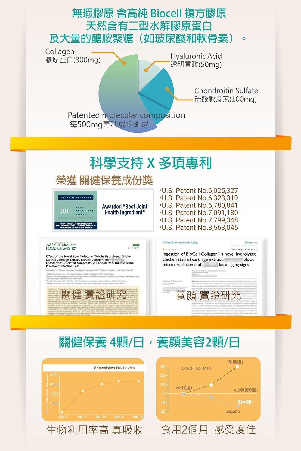 ✨Biocell 複方膠原( 含膠原蛋白+玻尿酸+軟骨素)✨專利成分,關健養顏同步照護 !✨有科學實證,更榮獲關健保養成份獎 !✅含高純 Biocell 複方水解膠原蛋白✅唯一天然富含醣胺聚醣 GAG及2型膠原蛋白的成分✅水解膠原分子小,實證有吸收有感覺✅關健保養(4顆/日) ,養顏美容(2顆/日)