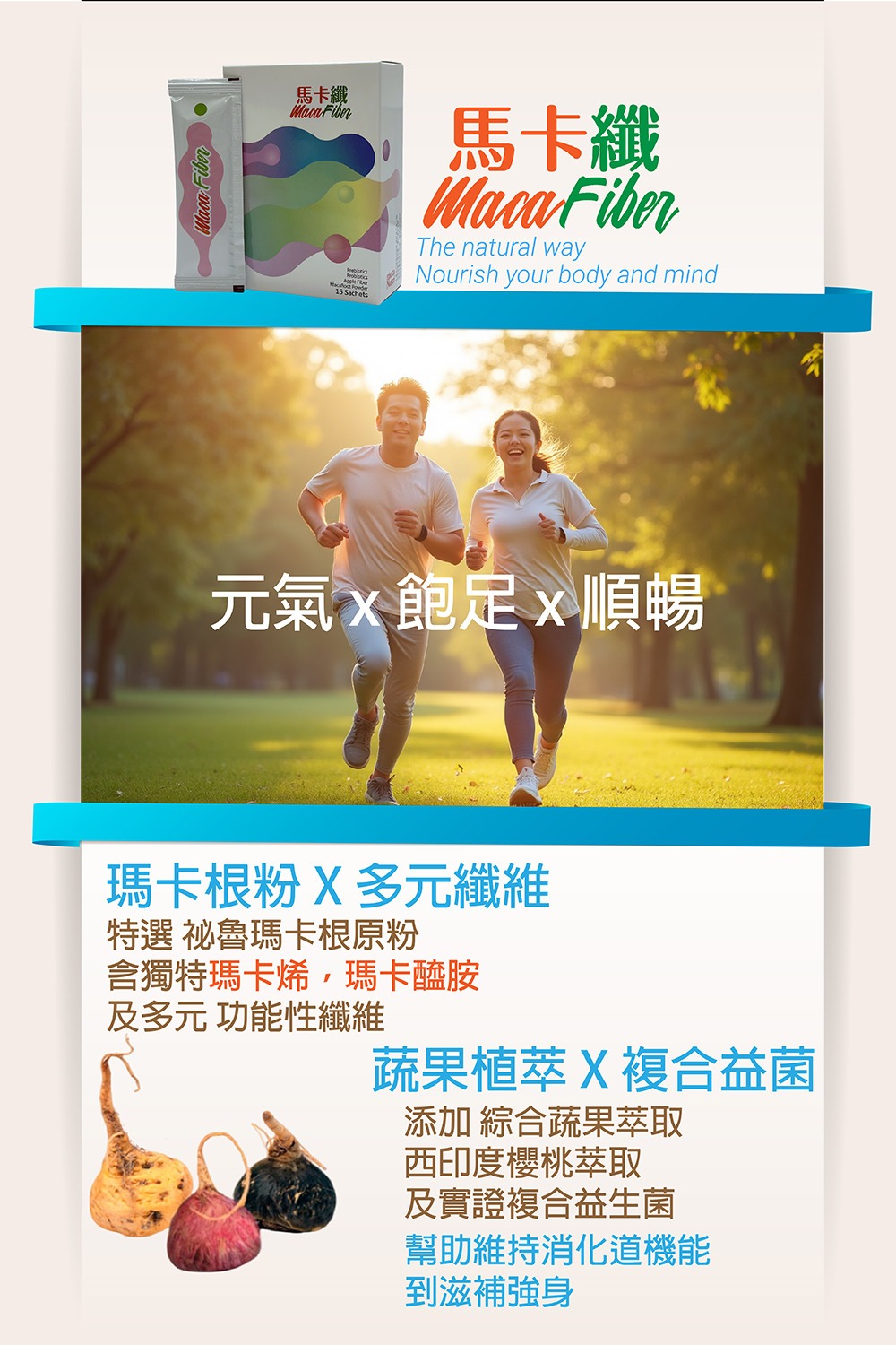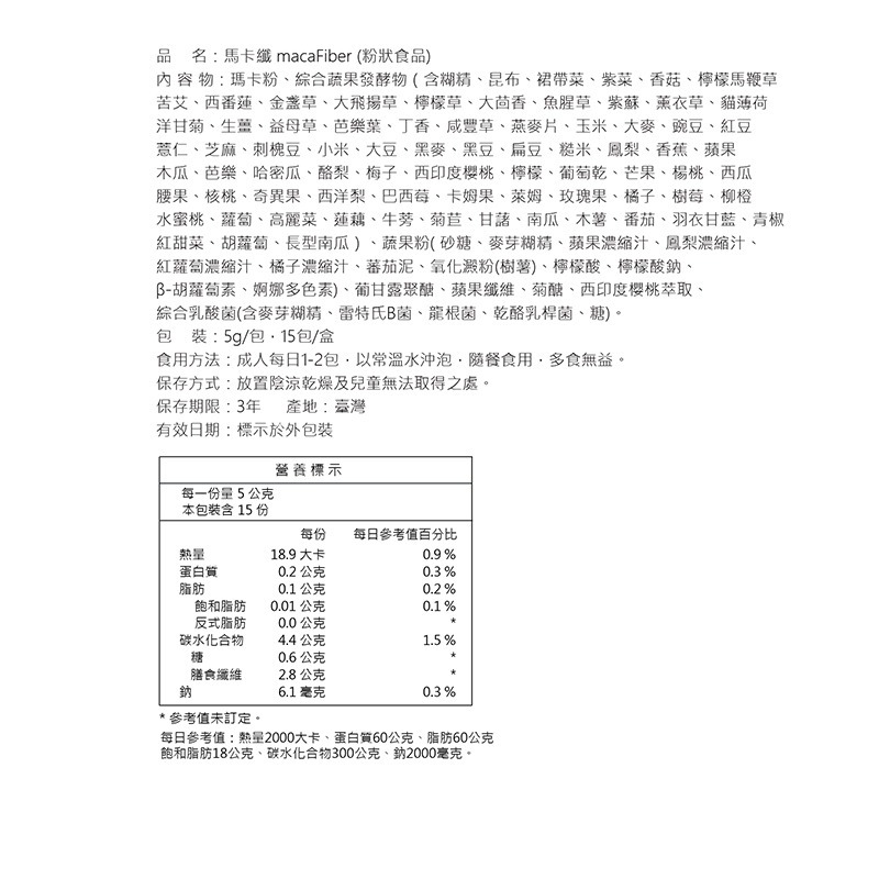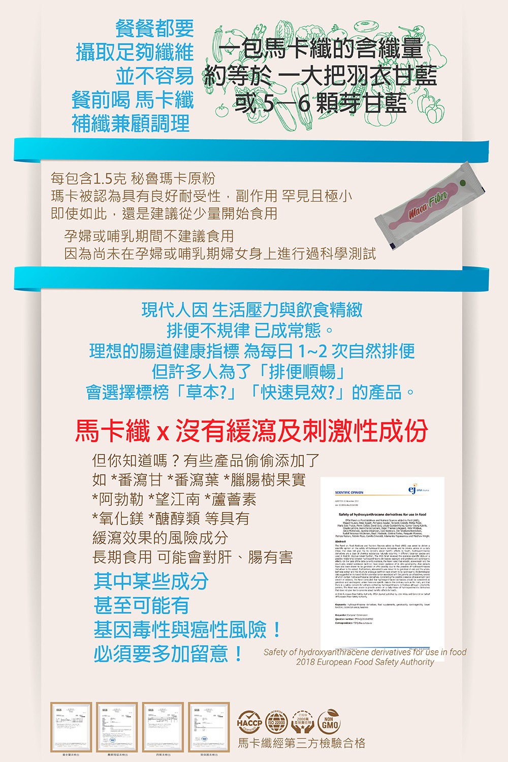 ✨馬卡纖到,元氣不鬧,不在蹲靠!✨秘魯瑪卡根 | 公認的適應源!✨ADM專利複合菌 | 改變菌叢生態!✨蔬果植萃 | 幫助維持消化道機能✨榮獲 2025 Monde Selection 世界品質獎項_提名標章 (NOMINEE )✅高效補纖,活力 x飽足 x順暢✅每包含2.8克纖維,理化特性好,CP值高!✅每包含1.5克 祕魯瑪卡原粉✅含西印度櫻桃萃取+蔬果萃取,養顏美容助消化✅添加西班牙大廠AD.M專利複合益生菌✅良心配方,沒有刺激性及風險性成份,找回規律排便 !