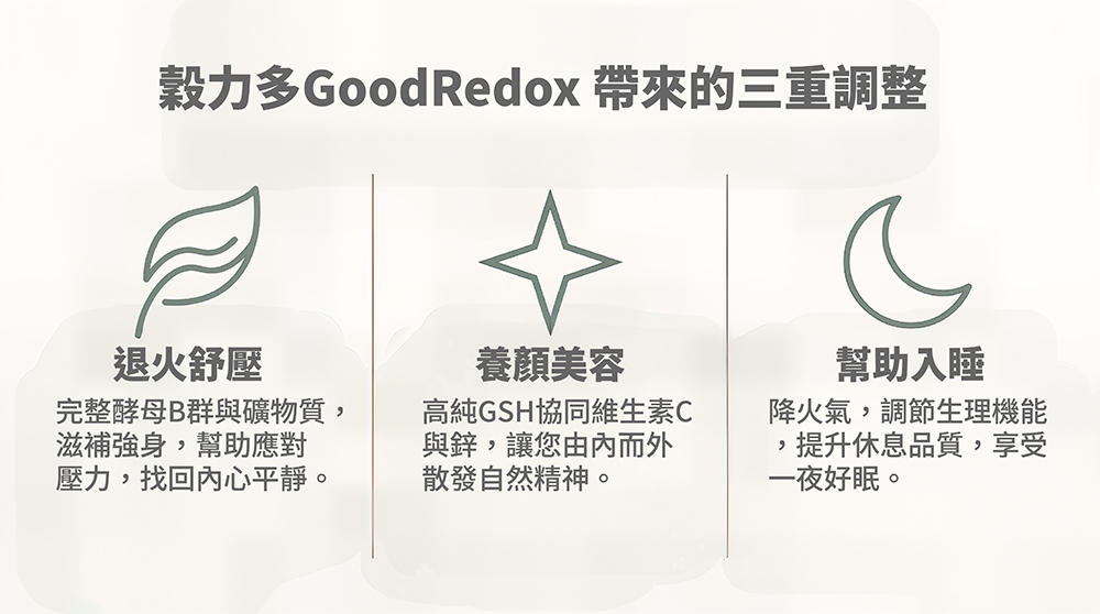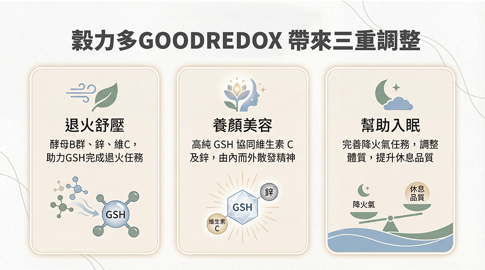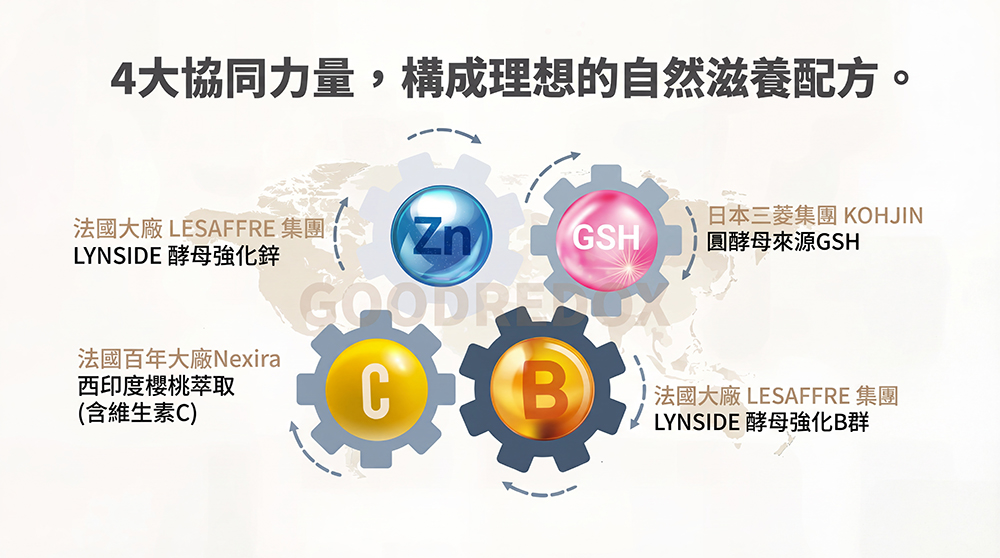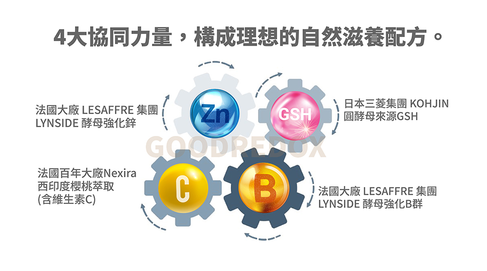 ⚛️自然酵母營養,拒絕化學合成!⚛️GSH+鋅+B+C,協同倍效助攻!⚛️自然派滋補強身,退火養顏!⚛️國際大廠自然營養,溫和補給!✅ 日本三菱集團 KOHJIN 圓酵母來源GSH(125mg /顆)✅ 法國LESAFFRE 集團, LYNSIDE 酵母強化鋅 (7.5mg /顆)✅ 法國LESAFFRE 集團, LYNSIDE 酵母強化B群✅ 法國百年大廠Nexira 西印度櫻桃萃取(含維生素C)